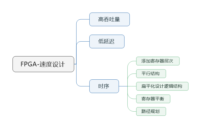 本章节主要是对FPGA 设计过程中,衡量系统速度的三个方面来进行的讲解。这三个方面主要是系统的吞吐量,延迟,以及基本时序。本章节着重讲了时序设计过程中,优化系统的几种方式,下图1是章节思维导图。