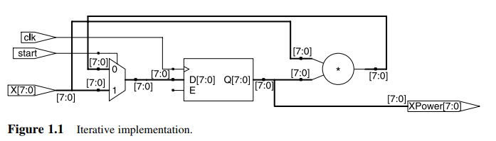 下图为迭代方式的电路结构,计算结构都是一个D触发器作为结果的缓存。完成一次计算需要3个周期,所以此设计吞吐量为 8/3(bit/clock)。