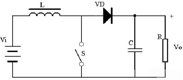 升压变换器原理图如图2所示,当开关闭合时,输入电压加在电感上,此时电感由电压(Vi)励磁,电感增加的磁通为:(Vi)*Ton。