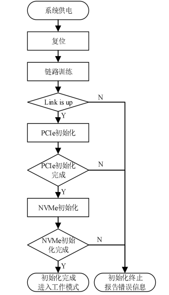 系统初始化的主要流程如图 1 所示, 在系统供电后, 首先进入复位状态, 一旦退出复位状态, 由 PCIE 集成块执行链路训练, PCIE 集成块提供了 LinkUp 信号用于指示链路训练是否成功。 链路训练消耗时间为毫秒级别, 为了确保系统的稳定, 在系统复位退出后 1 秒时如果 LinkUp 信号仍为低电平, 则断言为链路训练失败, 初始化流程终止。 如果 LinkUp 为高电平, 此时用户可通过系统控制模块启动 PCIe 初始化,进入 PCIe 初始化状态。 PCIe 初始化状态机在执行完初始化流程后, 会报告初始化执行状态, 如果在初始化过程中出错, 进入初始化终止状态并将错误信息反馈到初始化状态寄存器。 当 PCIe 初始化正常完成后, 可以进入 NVMe 初始化状态, NVMe 初始化也由用户通过系统控制模块启动。 当 NVMe 初始化正常完成后, 系统的初始化完成, NoP 逻辑加速引擎进入正常工作模式。