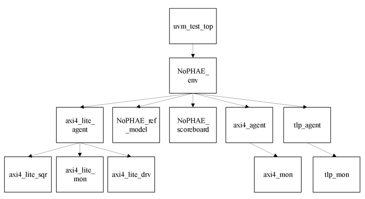 0赞UVM 验证包设计结构如图 1 所示。 UVM 验证包的主要功能是对 DUT 提供激励, 仿真验证对应的功能, 并对测试结果进行自动对比分析与统计。 验证包包含一个NoPHAE_env 验证环境, 验证环境下包含 axi4_lite_agent、 axi4_agent、 tlp_agent、NoPHAE_ref_model、 NoPHAE_scorebarod 组件。