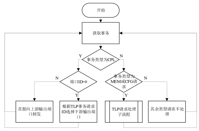 当对应任务接口的事务缓存中存在未处理事务时, 处理程序从缓存中获取事务。首先检查事务类型, 当事务类型为 Cpl 响应类型事务时, 如果当前程序对应接收端口号为 0, 即接收端口为唯一的上游端口时, 该响应类型事务需要根据事务中的请求 ID字段与配置空间封装类中的相关字段进行比较, 实现基于 ID 的路由; 如果对应接收端口号不为 0, 表示该响应类型事务来自下游端口, 此时直接将该事务转发到上游输出端口。 当事务类型为 MEM 读写请求或 CFG 配置读写请求时, 进入 TLP 请求处理子程序, 对于其它类型的请求暂不支持。