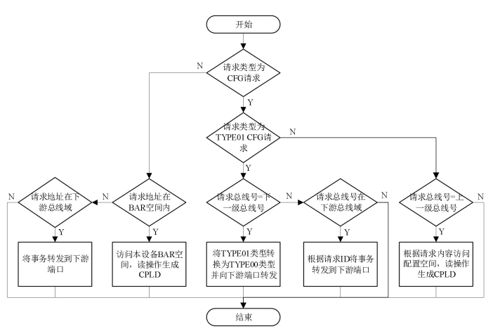 TLP 请求处理子程序流程如图 1 所示。 当请求类型为 MEM 读写请求时使用地址路由的方式。 如果请求地址在此设备 BAR 空间内, 则对 BAR 空间进行读写操作,读操作将生成 CplD, 从对应请求端口的输出端口发出; 如果请求地址在下游总线域,根据请求 ID 的设备号将事务转发到对应的下游输出端口。 当请求类型为 CFG 配置请求时采用 ID 路由的方式。 如果请求类型为 TYPE1 配置请求, 当请求 ID 中的总线号等于配置空间中的下一级总线号时, 表示请求发往连接到该桥设备的下一级设备, 将TYPE1 类型请求转换为 TYPE0 请求转发到下游端口; 当请求 ID 总线号位于下游总线域时, 直接根据请求 ID 将事务转发到下游端口。 如果请求类型为 TYPE0 配置请求,当请求 ID 总线号等于上一级总线号时, 表示请求发送到本设备, 根据请求内容访问本设备配置空间, 读操作将生成 CplD, 从对应请求端口的输出端口发出。