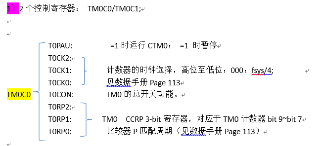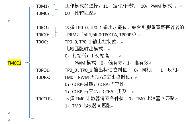 在 PWM 模式, TnIO1 和 TnIO0 用于决定比较匹配条件发生时怎样改变 TM 输