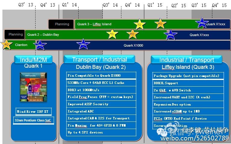 @李健-芯片战争:两张图看懂Quark系列的Roadmap,至少这个系列不会是昙花一现,而且很明显会向高性能方向发展,而短期内不会再向下去扩展,MCU应该不是主要的竞争对手。