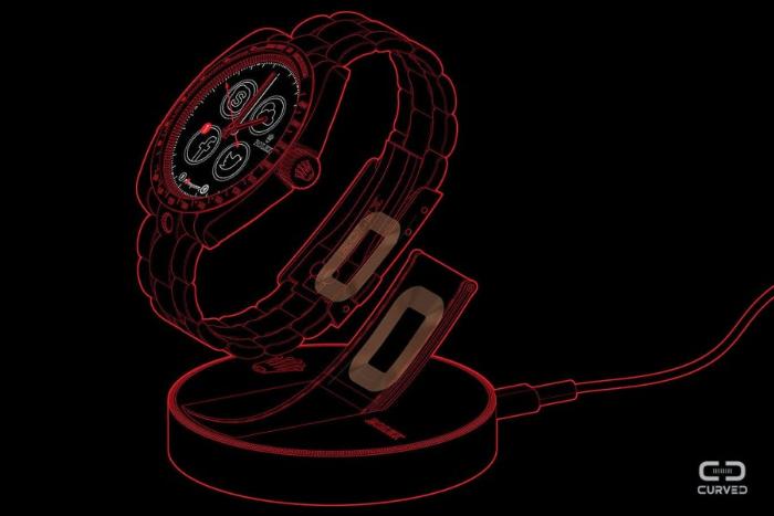 这块概念手表采用精钢表带,表带上还内置了一枚摄像头,此外还配备了一款设计同样非常典雅大方的充电底座。