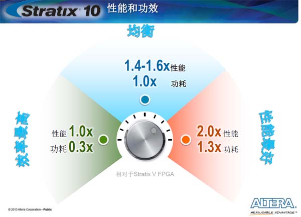 Stratix 10为客户寻求性能和功耗之间的平衡提供了多种选择。与Stratix V FPGA相比较,在同等性能水平下,Stratix 10功耗降低70%;如果要获得两倍于Stratix V的性能, Stratix 10的功耗只需要增加一点。这使客户在满足功耗和散热硬指标的情况下,可以获得系统更大的容量,提供更大的带宽。