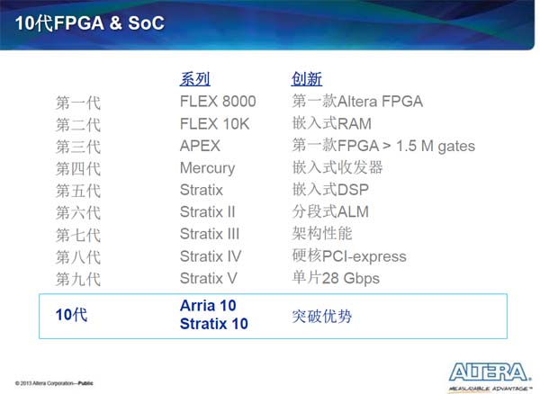 0赞Altera 近几代产品命名一直使用罗马数字,延续I、II、III这样的进程,28nm是Stratix V 、Arria V和Cyclone V。日前,在Altera下一代产品的吹风会得知,Altera的下一代产品将是出人意料的Stratix 10 、Arria 10。