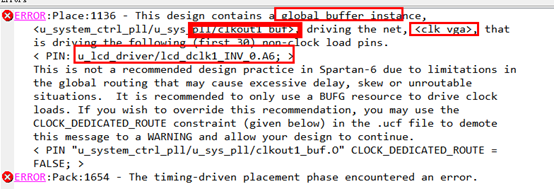 意思就是说从PLL的Buffer输出的时钟,不能直接输出到外部。。由于VGA的lcd_dclk是直接输出到外部的。。。。。而引脚直接输出PLL输出的时钟,并不是Spartan-6的推荐设计,由于全局布线的局限,这将会过多的延迟,抖动,甚至无法布线的情况。推荐只用一个BUFG源来驱动时钟。如果你想推荐这个推荐,你得使用CLOCK_DEDICATED_ROUTE约束来将警告将至,持续设计。