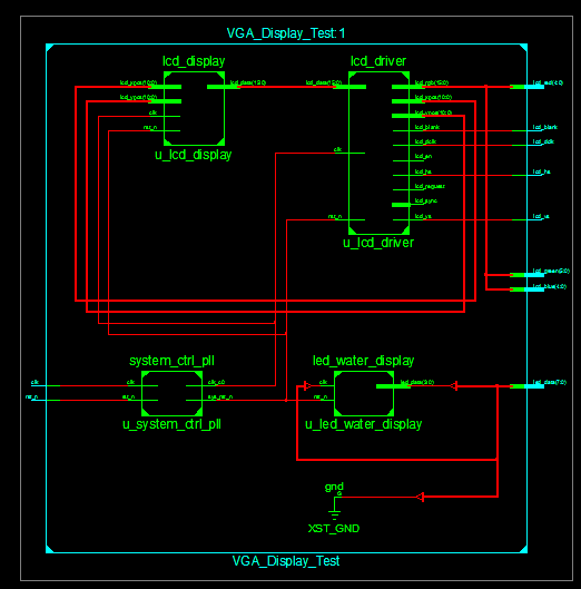 这里system_ctrl_pll为全局时钟控制模块、lcd_display为VGA显示模块、lcd_driver为VGA驱动模块,而lcd_water_display仅仅是LED的测试模块!ISEd RTL图看来来,视觉体验跟Quartus II的完全不一样 呵呵。。还没习惯,但至少还挺爽的 呵呵。。加油。、。