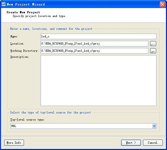 在该界面输入工程名、选择工程存放路径、选择顶层模块类型,其中顶层模块类型有硬件描述语言(HDL)、原理图(Schematic)、SynplifyPro默认生成的网表文件(EDIF)、Xilinx IP Core和XST生成的网表文件(NGC/NGO)这四种选项,这里我们使用Verilog模块作为顶层输入,所以选HDL。点击【Next】。