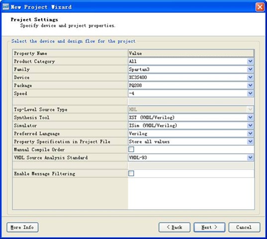 4、接下来是所选用芯片的一些属性设置,开发板用到的是Spartan3E系列的XC3S400-PQ208的芯片,请按如下图所示设置: