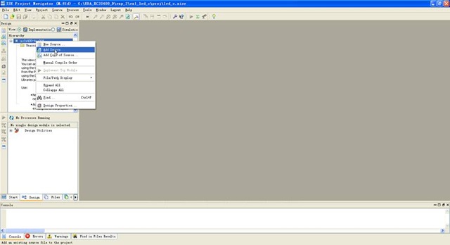 7、 接下来,我们要把编好的led_c.v文件添加到前面创建的空的工程里面,回到从前创建的工程或者打开保存的led_c.xise工程,在工程主芯片的名称上右键选择【Add Source…】,如下图所示: