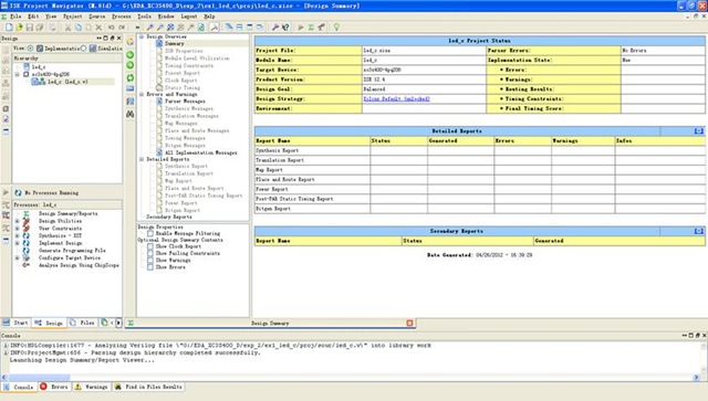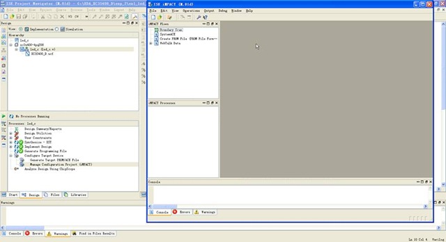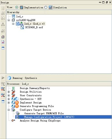 15、回到ISE 左侧中部的clip_image029[1],展开clip_image045可以看到其子项clip_image047,该项功能为将编译好的文件下载到CPLD/FPGA 芯片内部,双击该项,ISE 将对工程进行编译综合,如下图所示: