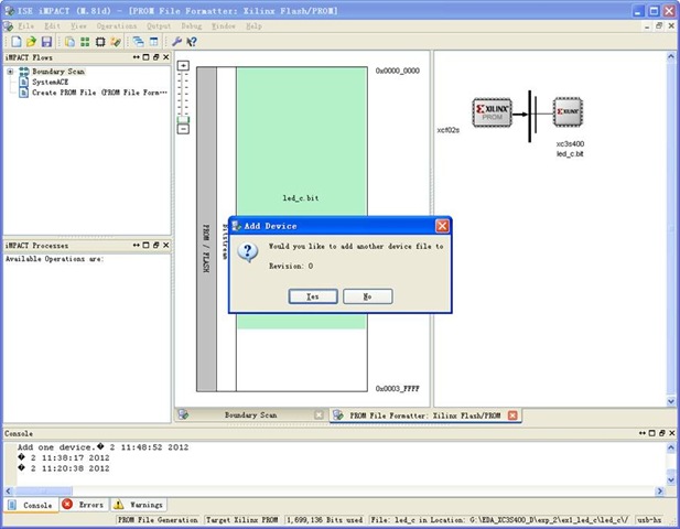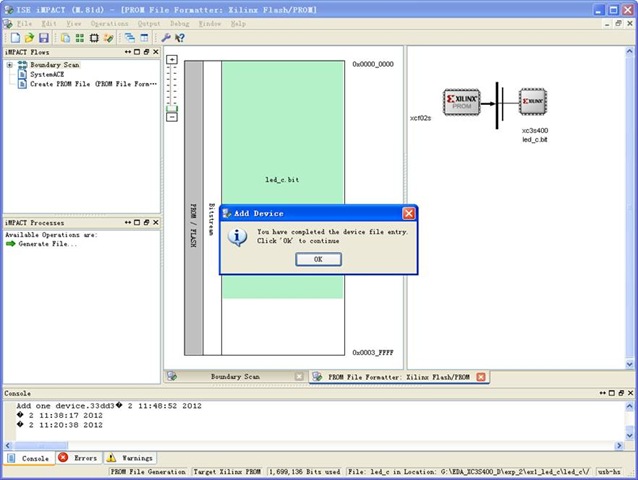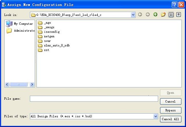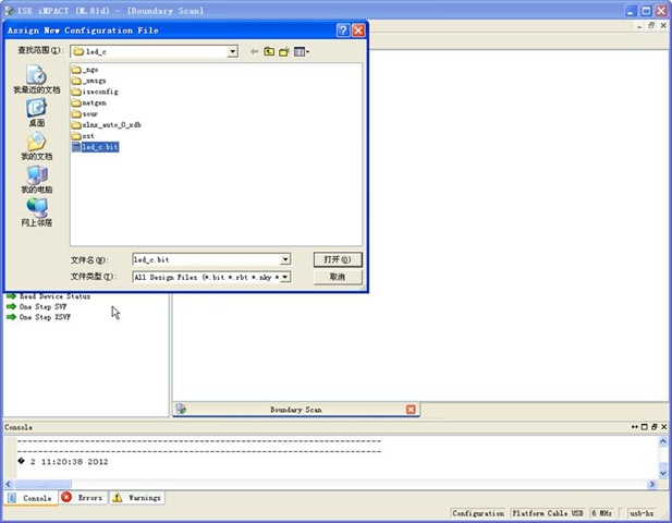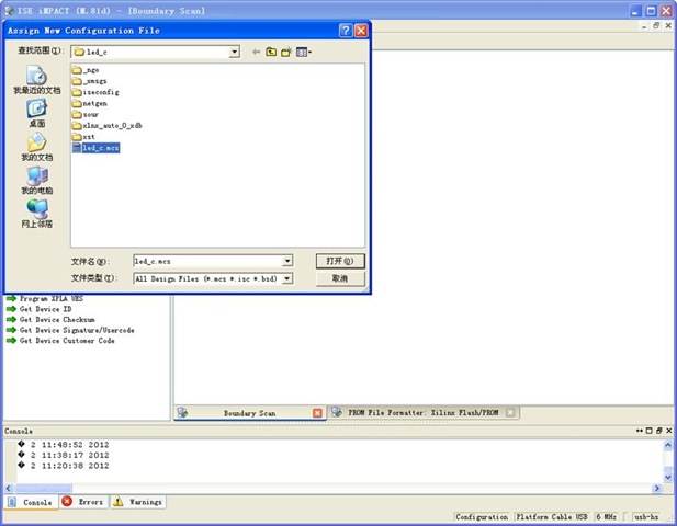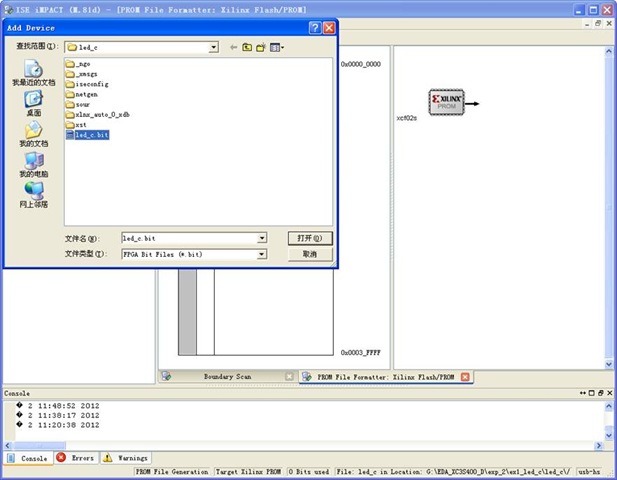 33、回到Boundary Scan 窗口,在XCF02S 上双击,找到刚生成的led_c.mcs 文件,如下图: