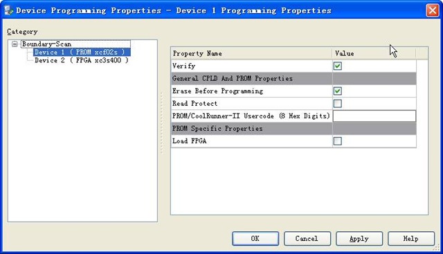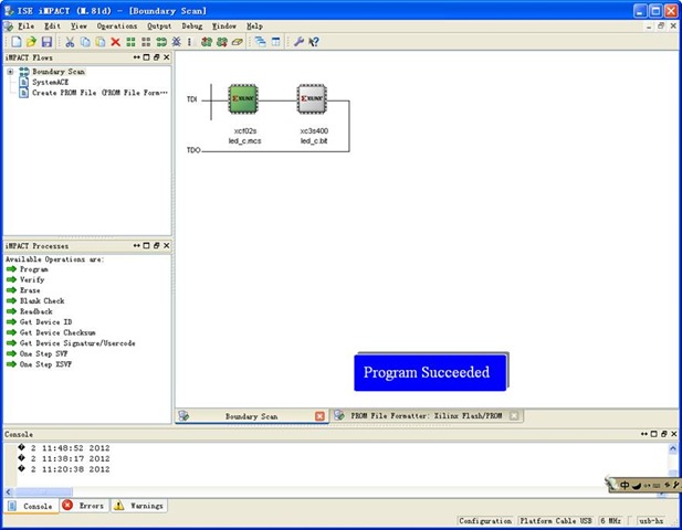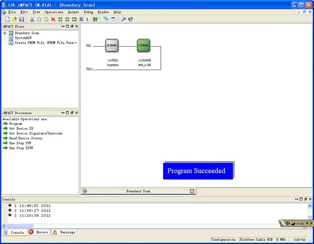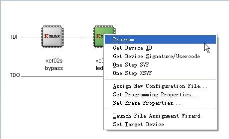 回到ISE 工程的Boundry Scan 窗口,可以看到左侧上部有几个编程选项,双击其中的clip_image071项,如下图所示:
