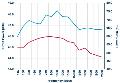 MHz范围内可提供50 W输出功率。 在全频率范围内,当馈入0 dBm的标称输入信号时,该放大器可实现46 dBm(典型值40 W)的输出功率水平。