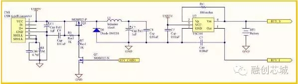 本方案在STM32F101上完成。BTY_CHRG(PB0)为定时器的PWM输出,用于控制MOSFET的开关程度,从而改变对锂电的充电电流。TSC101 用于充电电流的检测,将电流转换为电压量。BTY_V(PA3)和BTY_I(PB1)为STM32的ADC 输入通道。STM32通过采样充电电流BTY_I和电池电压BTY_V,来调整PWM输出的占空比,以实现闭环控制。当BTY_V小于4.2V时,逐步调整PWM波的占空比,使BTY_I达到1C进行充电。当检测到BTY_V大于或等于4.2V时,逐步调整PWM波的占空比,使BTY_I降至0.1C进行充电。当充电电流小于 0.01C 时,充电完成。