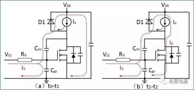 在t1时刻,MOSFET开通,漏极开始流过电流,在t1到t2期间,Ciss继续充电,栅极电压VGS继续上升,机理跟前一阶段完全一样,同时ID的电流从0开始不断的增加,ID的电流和VGS的值满足跨导的限制。