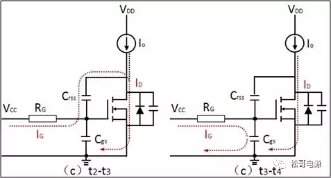 随着VDS电压不断降低,Crss的电荷被清除,当VDS电压降到最小值后不再变化,此阶段结束,对应时刻为t3。