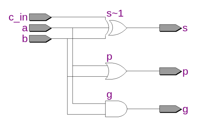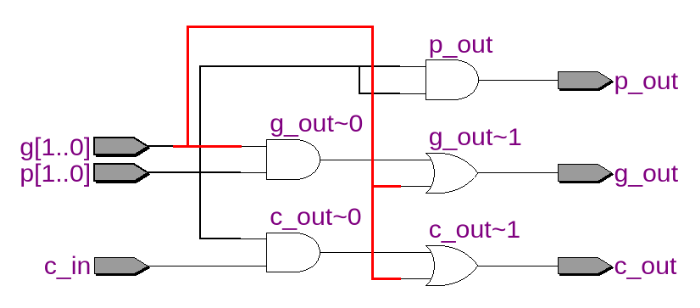 下图为GP生成器电路图,其连接两个上一级产生的模块,输出有3个信号,其中c_out将回传,用以求出本位和;g_out与p_out向下一级传递进位产生和进位传递信息。