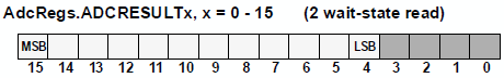 说了半天ADC的处理过程,那ADC的转换结果是最终如何处理的呢?因为F28x的ADC有16个模拟量输入管脚,所以对应的结果寄存器也有16个,即AdcRegs.ADCRESULTx,x的值从0到15。F28x片上自带的AD是12位精度,但是结果寄存器是16位的,这就涉及到存储的问题:器件手册规定,12位的转换结果保存在结果寄存器的高12位,即bit15是MSB,bit4是LSB,而低4位是无效的位,其存储示意如图1所示: