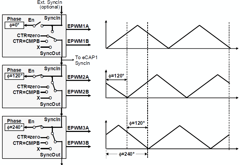 28335上的ePWM引入了很多增强的特性,从而使得我们可以更加灵活的进行组合配置,产生更复杂的PWM控制逻辑。例如,引入了基于事件基准的相位寄存器TBPHS。在对各个PWM进行单独控制的时候,TBPHS的值并无作用,但是,如果我们想把各个ePWM的三角形载波之间建立角度上的联系,则我们可以使用TBPHS寄存器,例如下面的例子: