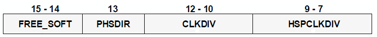 9~7 HSPCLKDIV 高速基准时钟分频位,TBCLK=SYSCLKOUT/(CLKDIV×HSPCLKDIV)