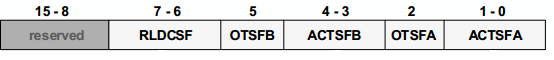 输出A的连续软件强制触发控制 在立即模式下,强制动作发生在下个TBCLK的边沿;在映射模式下,强制动作发生在装载后的下个TBCLK边沿,可用AQSFRC[RLDCSF]位控制是否使用映射模式 00:无动作 01:连续强制EPWMxA为低电平 10:连续强制EPWMxA为高电平 10:软件强制禁止,无动作 |