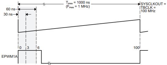因为MEP的作用时间要之后3个或者6个系统时钟周期(30或者60ns),所以MEP的作用范围在占空比很低的时候收到了限制。以上图中为例,如果传统的PWM波形在这个开关周期内占空比小于3个或者6个系统时钟周期,则MEP无法对其进行任何校正,原理不难解释,因为MEP还未开始工作,相当于HRPWM在这段时间内还未起作用。当然这样的情况在实际系统里是很少见的,例如在逆变器输出电压控制的应用里,只有在期望的输出电压靠近过零点的时候PWM占空比才会非常的小;如果把这么小的占空比作为额定状态,显然是对DSP和MOSFET等资源的浪费。