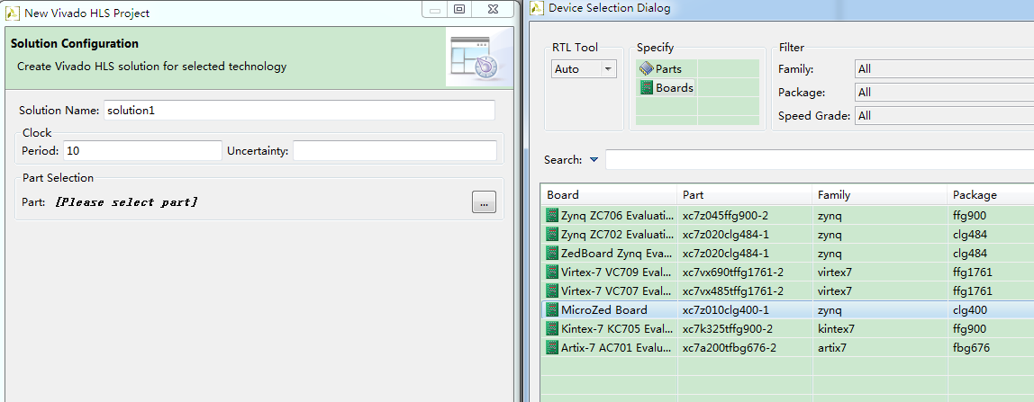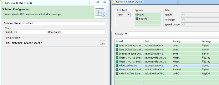 点击Next,然后输入项目工程,暂时先不指定和添加源程序,在提示选择器件类型时选择开发板MicroZed,如图2所示。然后点击Finish就完成了Vivado HLS工程的创建。
