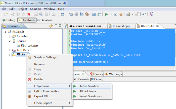 程序输入完成之后,可以进行对C/C++代码的综合了。在Vivado项目管理器中的Solution上点击右键,选择C Synthesis,如图4所示。