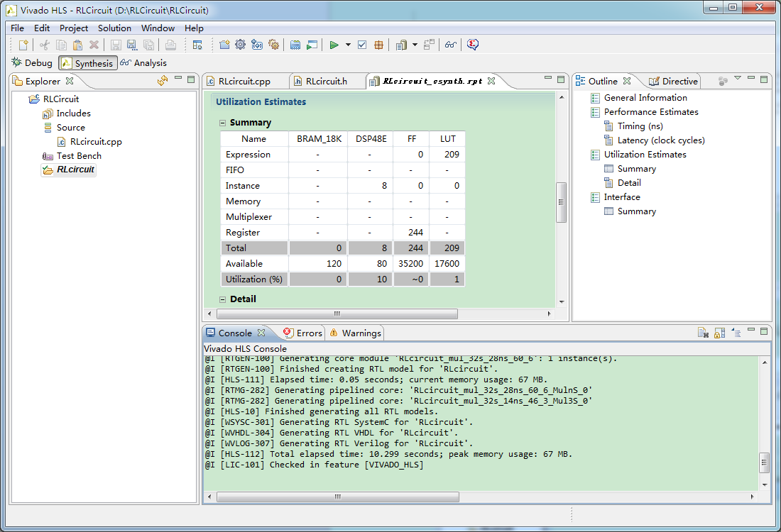 如果有错误,比如某个变量未定义之类的,Vivado HLS会提示我们详细的错误信息;在没有错误之后,Vivado HLS很快就完成了C代码的综合过程,如图5所示。