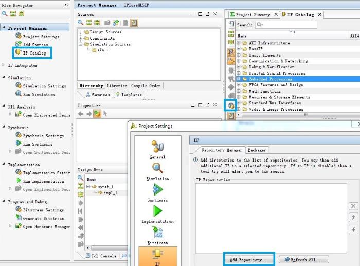 然后,新建一个Vivado的RTL工程,先不指定工程文件,并选择开发板为MicroZed。工程建立之后,选择工程管理器中点击IP Catalog,在弹出的IP Catalog中点击右键,或者直接点击齿轮形状的设置按钮,打开IP的设置,然后点击Add Repository,把我们自己建立的IP导入Vivado IPI的IP“仓库”中,如图1所示。