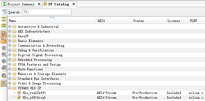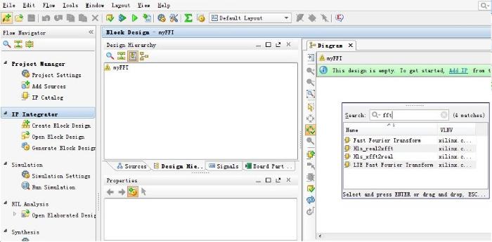 接下来,我们就可以在Vivado IPI中例化一个我们从HLS中生成的IP了。点击Vivado工程管理器中,IP Integrator下面的“Create Block Design”,然后点击ok,完成一个模块文件的设计。因为新的设计模块文件中还没有任何IP,所以Vivado会提醒我们添加IP。点击IP,并输入关键字FFT,此时包含FFT的IP被列举出来,如图3所示,其中,中间两个为我们在Vivado HLS中导出的IP。