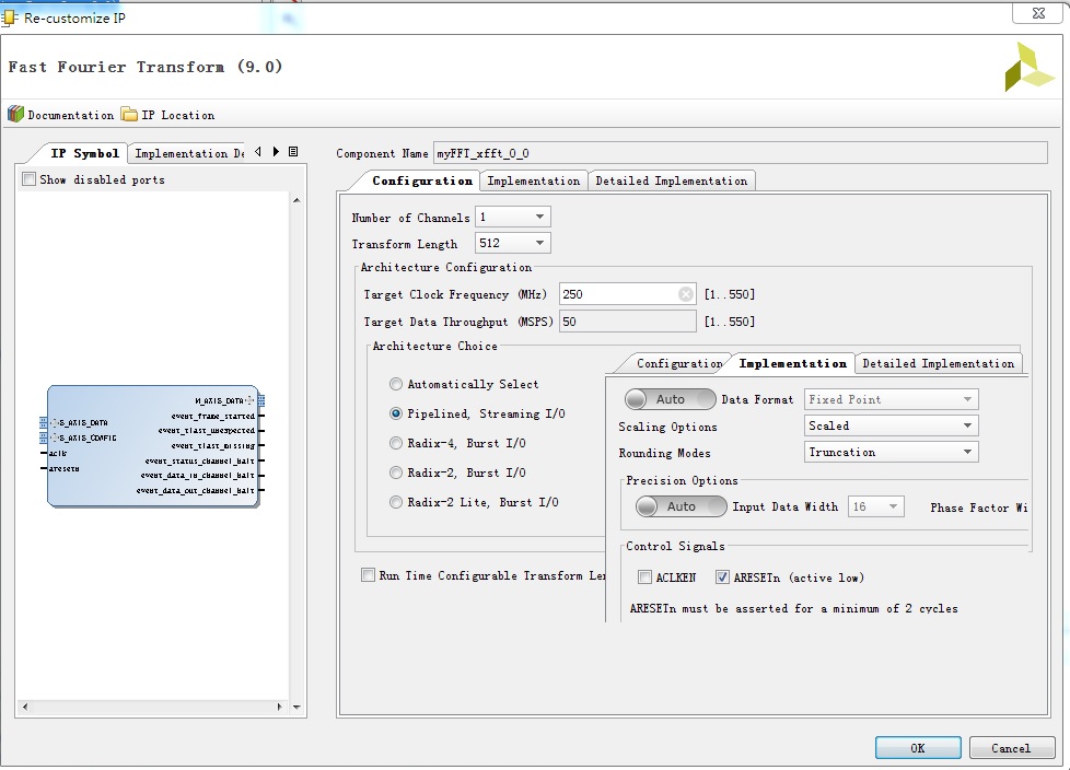 然后例化Vivado 自带的IP。双击图3中的Fast Fourier Transform,或者把它拖拽到模块文件的视图中,等待片刻之后,该IP的一个例化被加入到IP模块设计文件的视图中。然后双击例化之后的IP模块,打开它的配置,如图4所示。