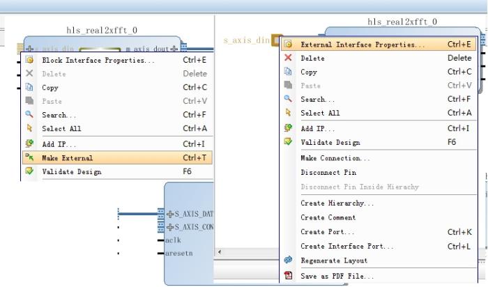 在第一个模块的s_axis_din上面点击右键,选择Make External,然后在生成的端口上点击右键,选择External Interface Property,更改它的名字, 如图6所示。