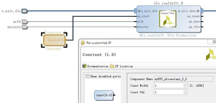 按照同样的方法,把Hls_real2xfftIP模块的aclk端口和aresetn端口都设为外部端口,在该IP的ap_start端口上则点击右键,选择Add IP,添加一个Constant IP,即接口信号为常数,如图7所示。