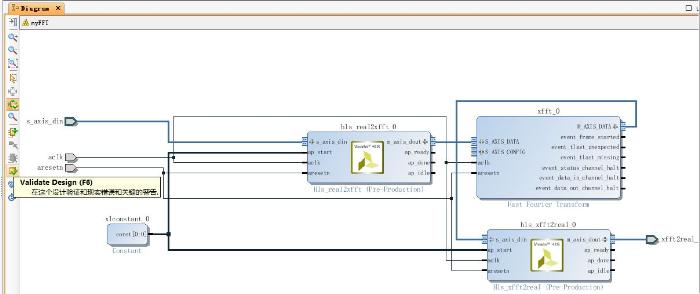同理,把Hls_xfft2real模块的ap_start也连接到图7中创建的Constant模块上,并把FFT和Hls_xfft2real模块的aclk都连接到第一个IP的aclk连线上,它们的aresetn则都连接到第一个IP的aresetn连线上,最后则配置输出端口,把Hls_xfft2real的输出数据端口配置为外部连接端口,并重命名,最终的连续如图8所示。