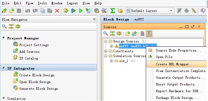 既然在Vivado IPI中的IP配置已经完成,接下来就可以产生HDL文件,让Vivado自动把相关的IP打包例化了。首先点击Vivado设计流程管理器中,IP Integrator下面的Generate Block Design,从而把图形化的IP设计文件导出为Vivado源程序,然后在生成的.bd文件上点击右键,选择Create HDL Wrapper,从而产生HDL打包文件,如图9所示。