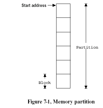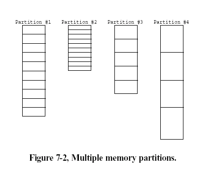如图 F7.2,在一个系统中可以有多个内存分区。这样,用户的应用程序就可以从不同的内存分区中得到不同大小的内存块。但是,特定的内存块在释放时必须重新放回它以前所属于的内存分区。显然,采用这样的内存管理算法,上面的内存碎片问题就得到了解决。