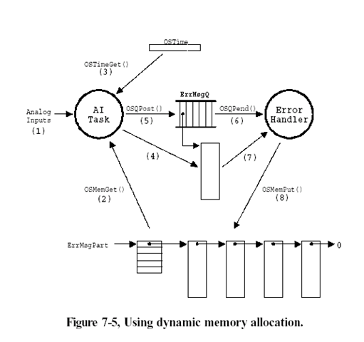 图 F7.5是一个演示如何使用µC/OS-II中的动态分配内存功能,以及利用它进行消息传递[见第6章]的例子。程序清单 L7.8是这个例子中两个任务的示意代码,其中一些重要代码的标号和图 F7.5中括号内用数字标识的动作是相对应的。