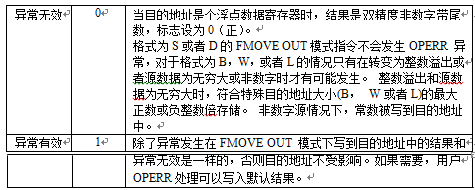 | 异常有效 | 1 | 除了异常发生在 FMOVE OUT 模式下写到目的地址中的结果和异 常无效是一样的,否则目的地址不受影响。如果需要,用户 OVFL 管理可以写默认结果。 |