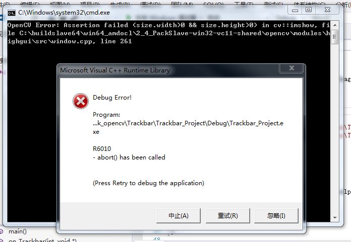 错误是啥意思我也没看懂,不过还是马上察觉到哪里出了问题,代码中我读入图像数据用的是相对路径"1.png",而生成的exe文件与图像却不在同一级目录下,这才导致了错误的发生,于是改用绝对路径替换"H:\\Work_opencv\\Trackbar\\Trackbar_Project\\1.png",不料还是出现同样的错误: