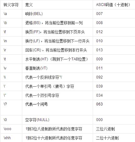 在计算机中,有一批特殊形式的不可打印字符、单引号、双引号、反斜杠、回车退格等,需要用转义系列表示。例如printf函数使用的\n就是一种以“\”开头的字符序列,代表换行的意思。这种非显示字符难以用一般形式的字符表示,所以C语言规定用“\”开头的字符其后跟随的字符用另外的意思代替,“\”及其后有特殊意义的字符序列称作转义字符。常见转义字符如下: