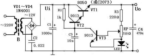 变压器B选用功率在15W以上,以保证有较大电流的输出。当负载电流≥300mA时,VT1应选用C2073等中功率管且加装适当的散热片。
