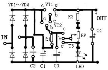 晶体三极管VT1、VT2组成复合调整管,VT3为比较放大器,R3、RP既作为LED的限流电阻,同时又与LED共同组成取样及基准电压电路。