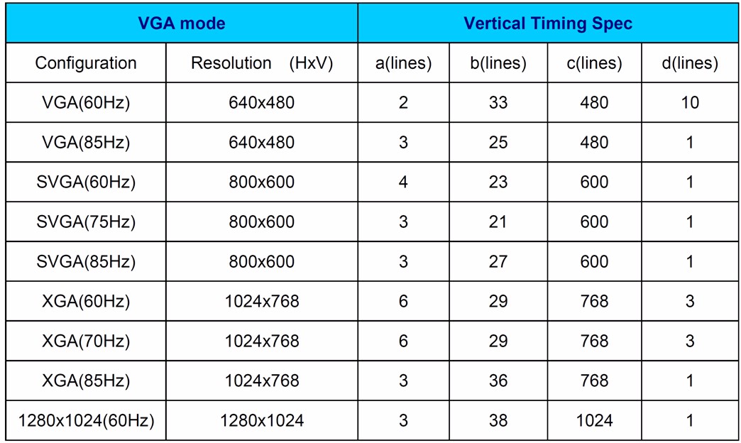 VGA的时序包括水平时序和垂直时序,且两者都包含的时序参数有:水平(垂直)同步脉冲、水平(垂直)同步脉冲结束到有效显示数据区开始之间的宽度(后沿BP)、有效显示区宽度、有效数据显示区结束到水平(垂直)同步脉冲宽度开始之间的宽度(前沿FP)。水平有效显示区宽度与垂直有效显示区宽度逻辑与的区域为可视区域,其他区域为消隐区。