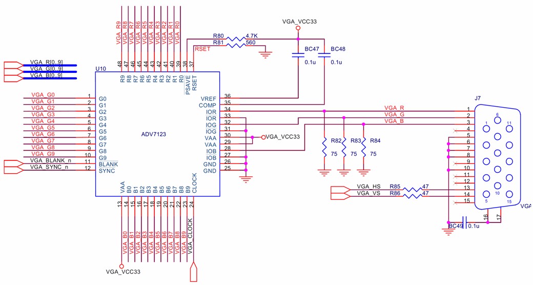 VGA输出图像方便,实用,因而很多设备都使用VGA来输出模拟视频信号,ADV7123为数模转换芯片,内置3路10bit DA,使用原理图如图所示。