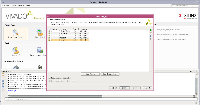 add netlist source。注意,一定要指定top netlist,在我这个例子里就叫top.edf。另外,”Copy sources into project”,是默认勾选的,建议将netlist copy到vivado目录下。